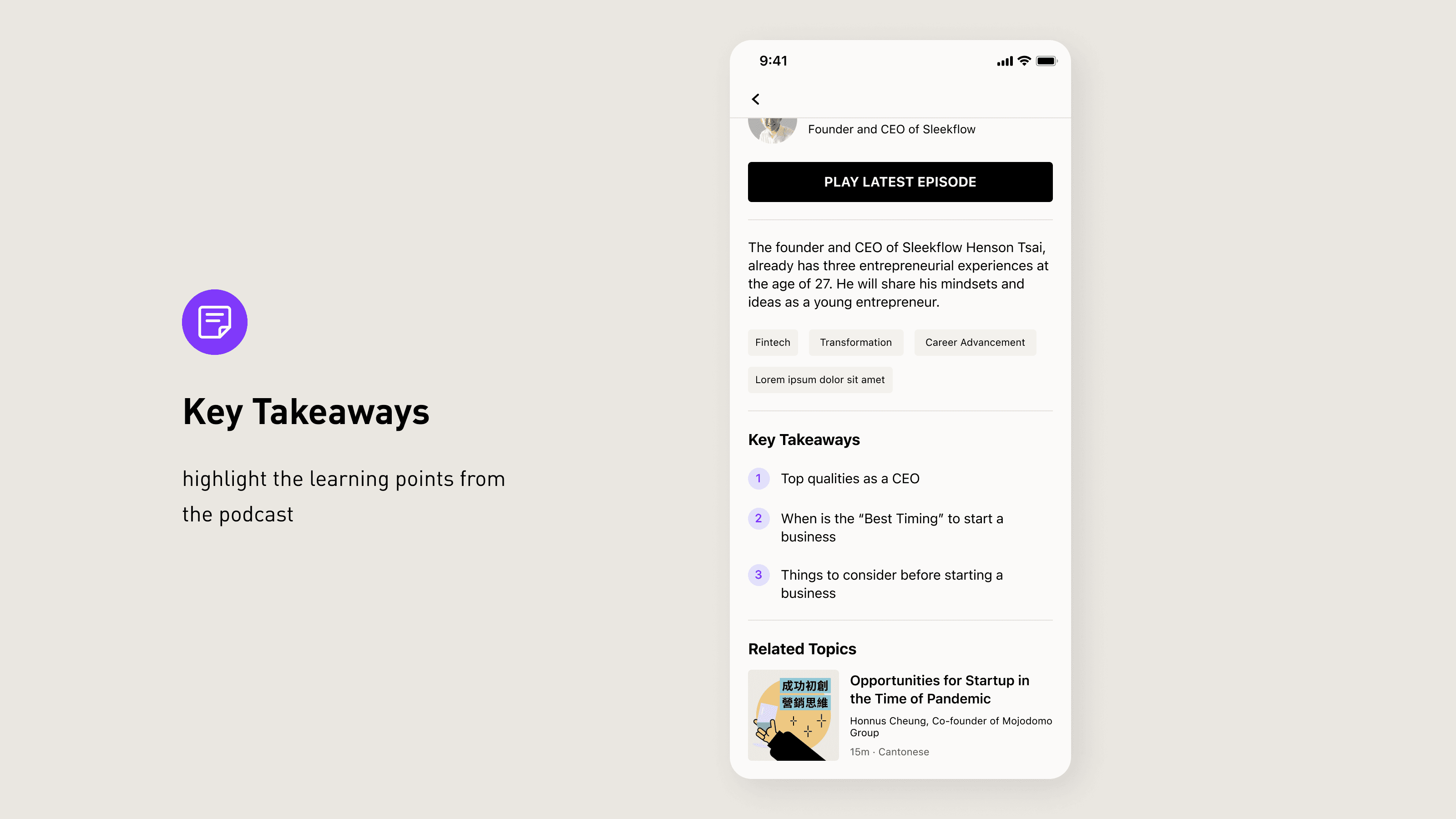 Adding a section to highlight the learning points from the podcast. Giving a quick overview of what users will be listening to.