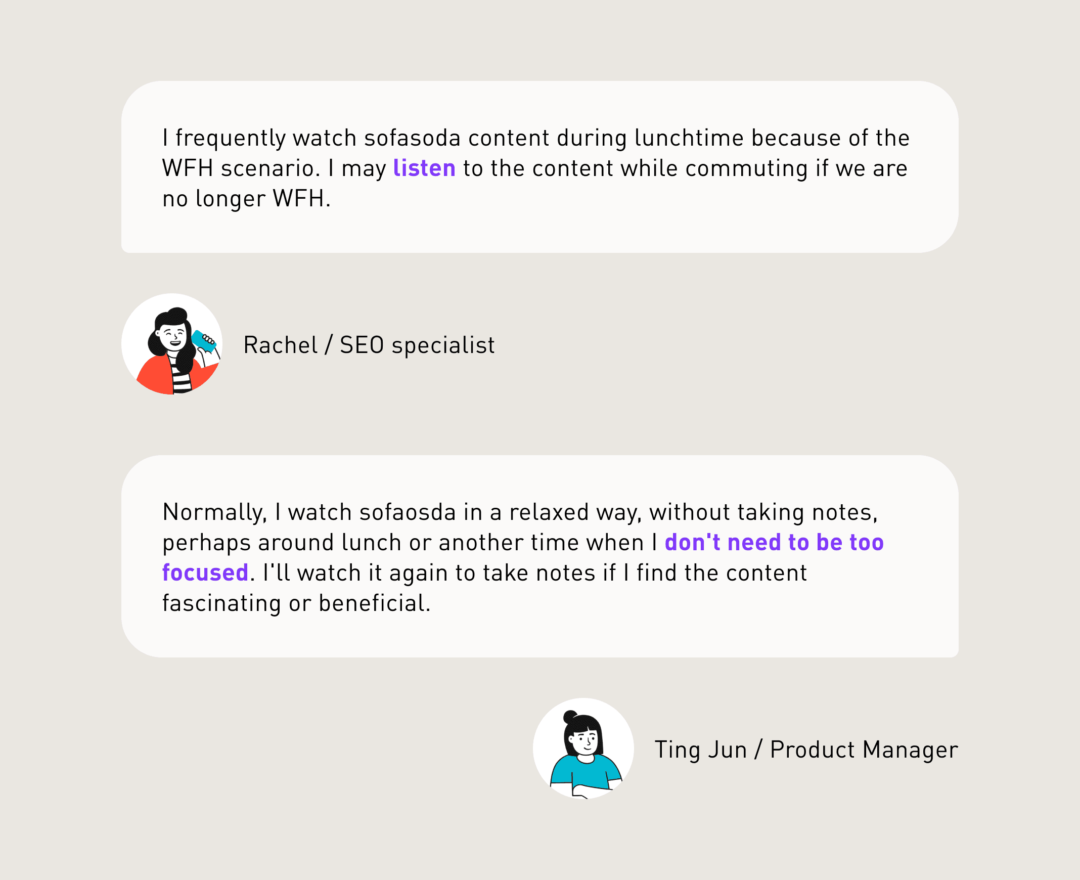 According to our user behavior survey, some people use sofasoda while doing things that doesn't need a lot of concentration, such as commuting or chores. We can provide lightweight content like podcast in order to entice more active learners to subscribe.