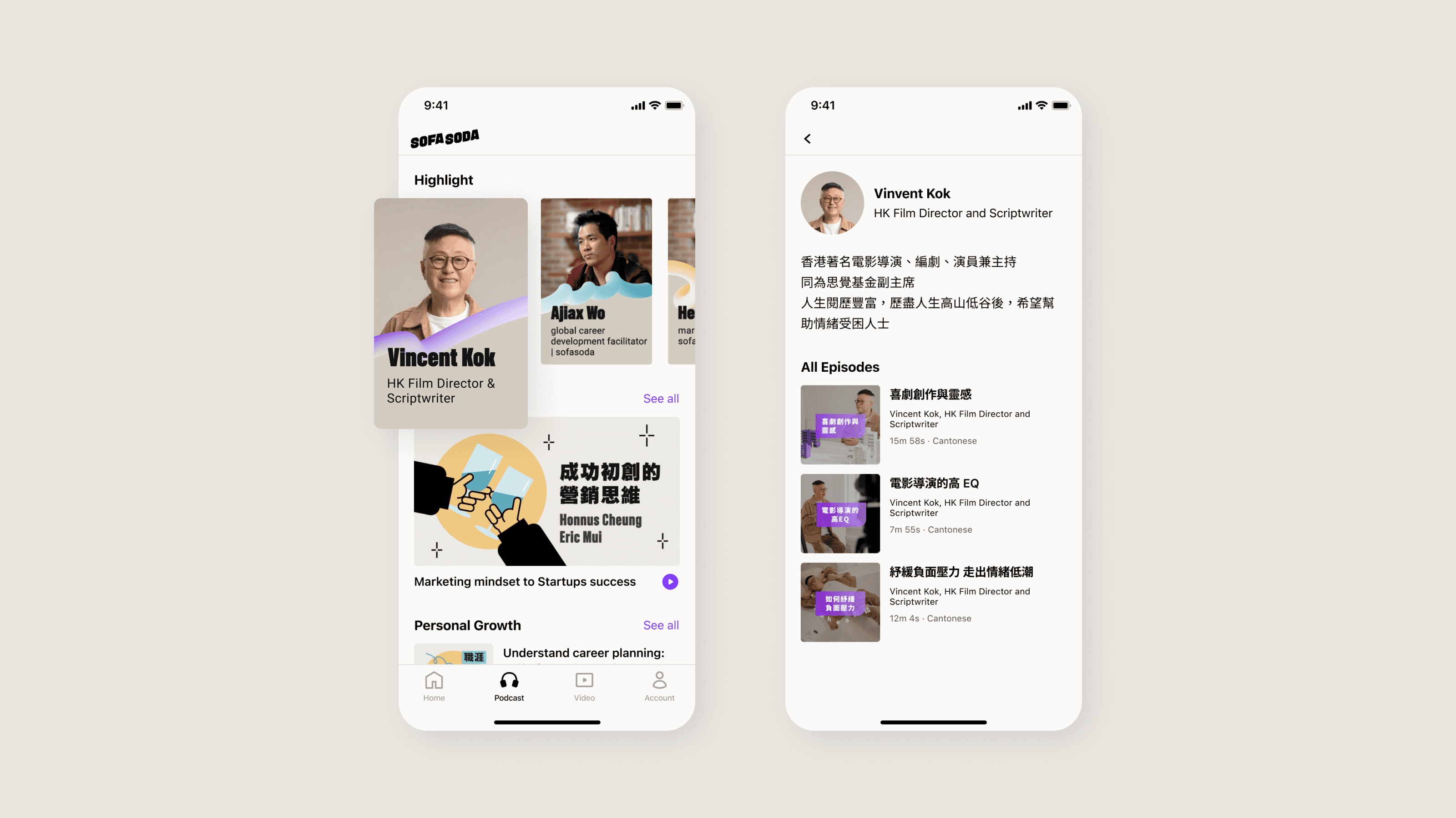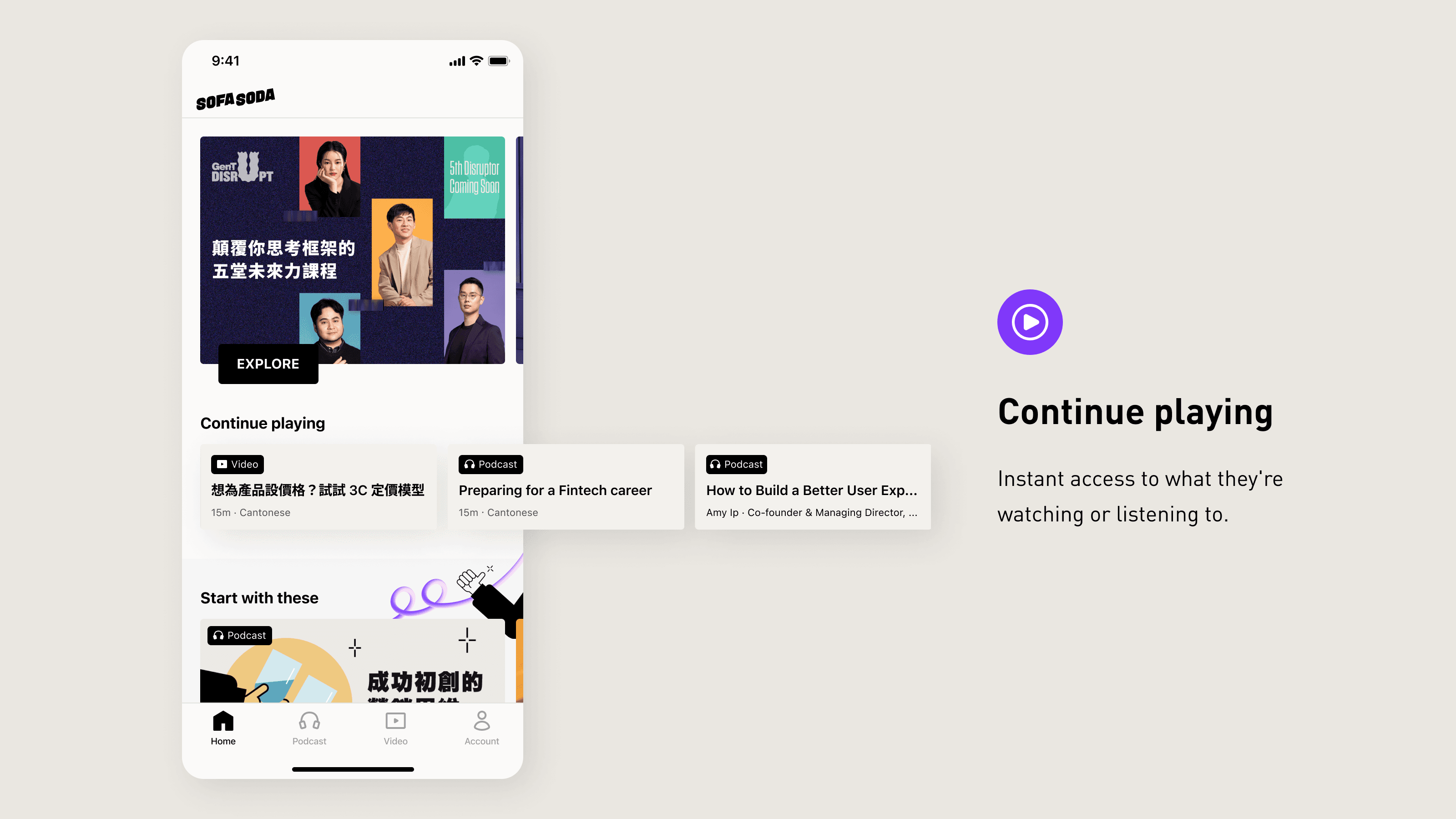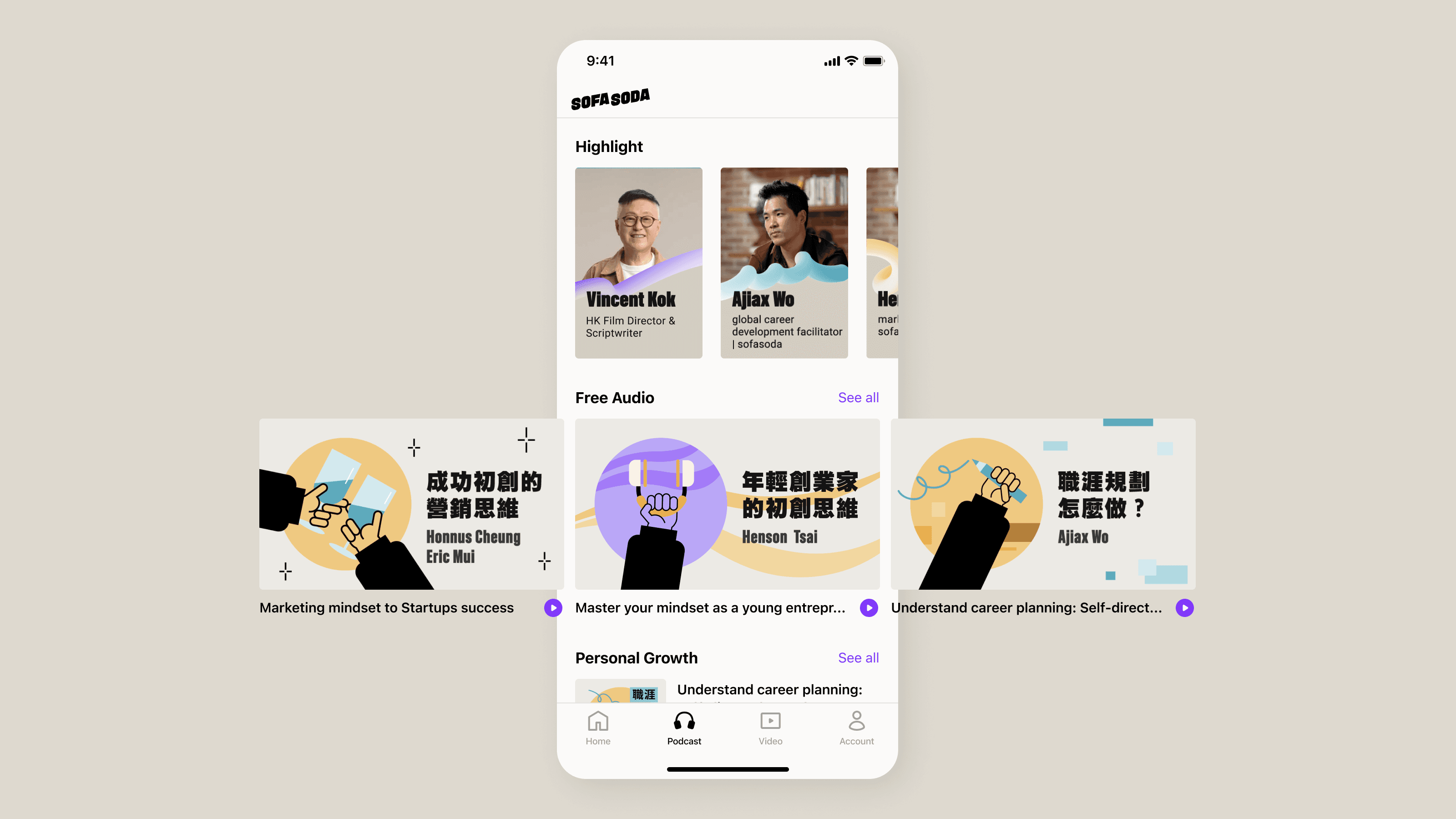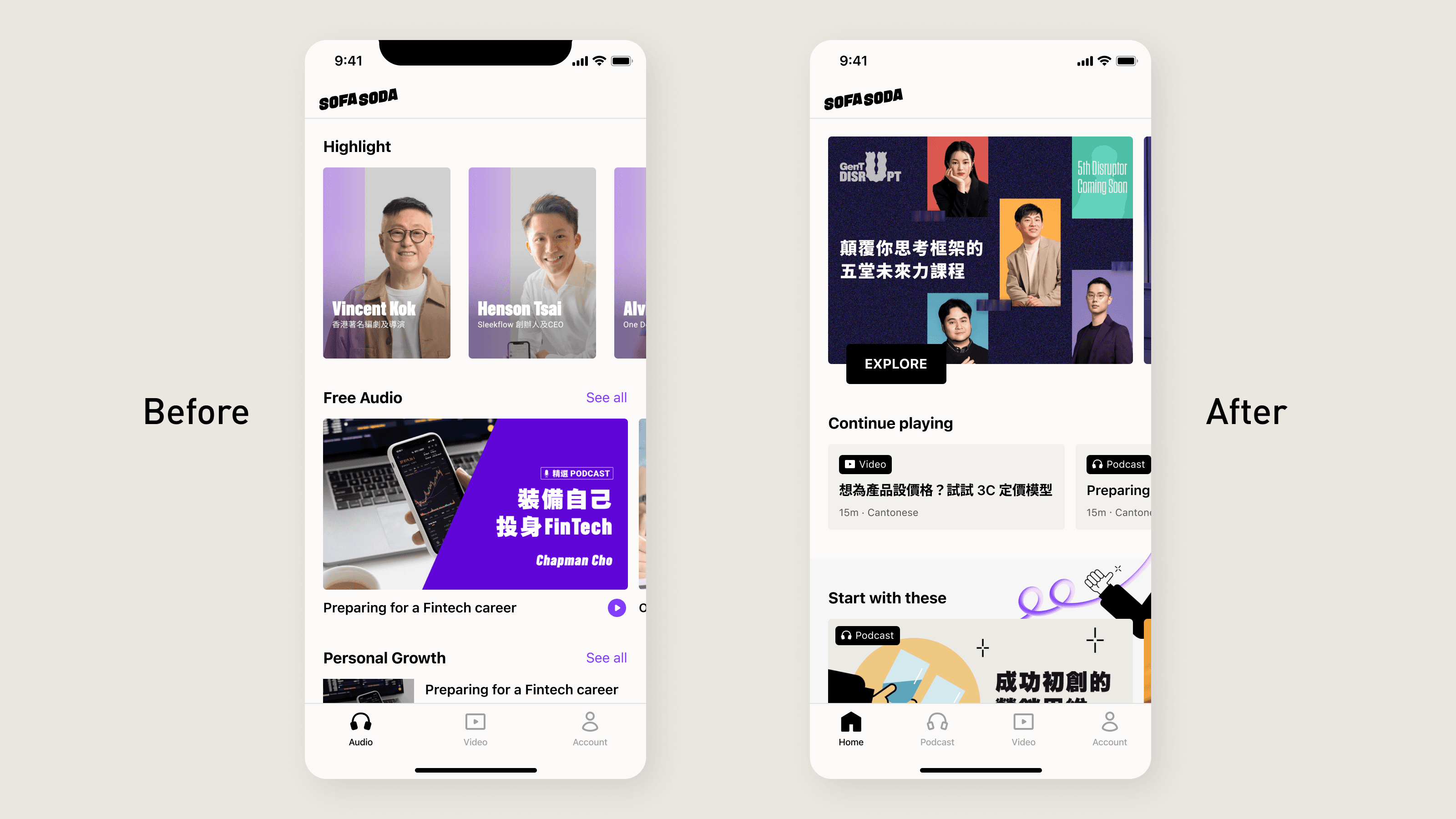 sofaosda values both podcast and video content. Users used to just see podcasts when they first opened the app, but we changed that by creating a new tab that gives a quick overview of our content.
